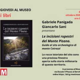 Appuntamento con l’archeologia rupestre delle montagne toscane il 23 ottobre alle ore 21.00 per i Giovedì al Museo con la presentazione del volume Le incisioni rupestri del Monte Pisano. Guida al sito archeologico di monte Cotrozzi, ospiti Gabriele Panigada e Giancarlo Sani. È possibile assistere all’incontro sia in pr , ... - 24Esposizione di Sergio SuffrediniTutto il giorno