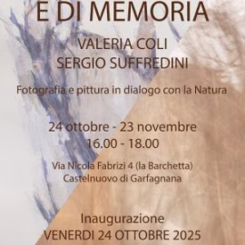 Presso la sala della Galleria di Valeria Coli in loc. Barchetta si terrà la mostra fotografica e di pittura in dialogo con la natura “Di Percezione e di Memoria” di Valeria Coli e Sergio Suffredini Inaugurazione Venerdì 24 Ottobre ore 17.30 , ... - 1